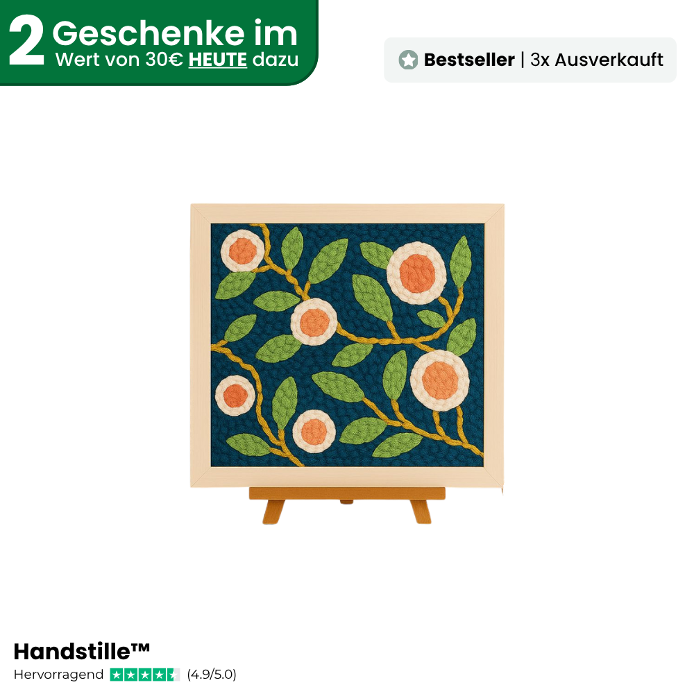 Rahmen, Garne, Nadel, Stoff mit Motiv, Anleitung, Bonus-Guide & Playlist.